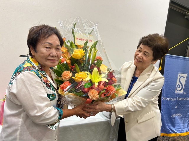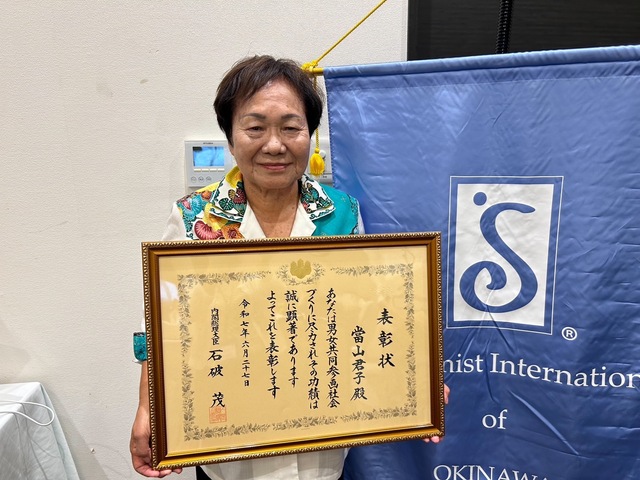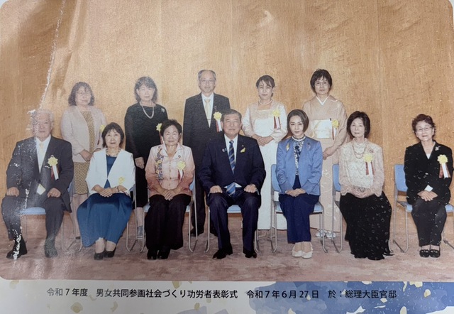日時 2025年06月27日▼當山 君子さん,右は首相、首相官邸女性の社会進出や地位向上に貢献した、當山君子会員は、半世紀にわたり生活改善活動に参画し、農村女性リーダーで、農村女性の資質向上や地域活性化支援の取り組みに尽力しました。新城伸子会長より、定例会にて花束贈呈。